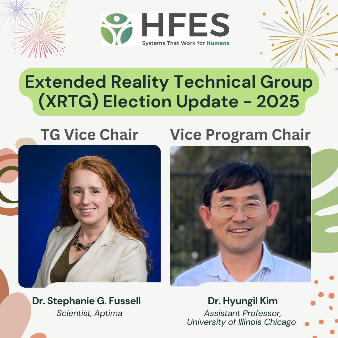 Program Vice Chair: Hyungil Kim (hyungil@uic.edu) is an Assistant Professor of Industrial Engineering at the University of Illinois Chicago. He is currently leading the Human-Centered Engineering lab (https://sites.google.com/view/human-centered-engineering) where his team explores new methods for the requirements analysis, design, prototyping, and evaluation of extended reality applications with an emphasis on human-technology partnerships at future workplaces. Dr. Kim received a Ph.D. in industrial and systems engineering specializing in human factors and ergonomics from Virginia Tech. He has more than 10 years of research experience in extended reality and has published over 30 papers in top conferences and journals such as ASPIRE, IEEE Virtual Reality, IEEE International Symposium on Mixed and Augmented Reality, IEEE Transactions on Visualization & Computer Graphics, and Human Factors. He has been actively serving the above research communities as a conference and workshop organizer. He has been a member of HFES since 2014 and an officer of the extended reality technical group (XRTG) since 2023. He previously served XRTG as the Treasurer, and in 2025, he was elected as the Program Vice Chair.
