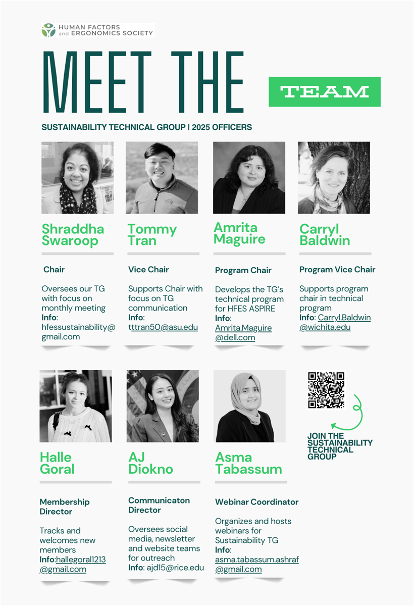Now that our most recent leadership appointments for Human Factors & Ergonomics Society Sustainability Technical Group have been made, we are happy to announce our new membership director, communication director and webinar coordinator: