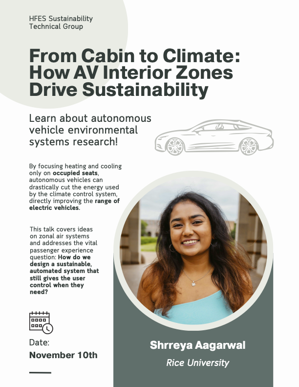 Just as a reminder, the Sustainability Technical Group (STG) will have our monthly meeting on Monday, November 10th at 9 am PT / 11 am ET. We'll be featuring Shrreya Aagarwal, PhD student in Human-Computer Interaction and Human Factors from Rice University. Hop on the call to learn about autonomous vehicle environmental systems research!